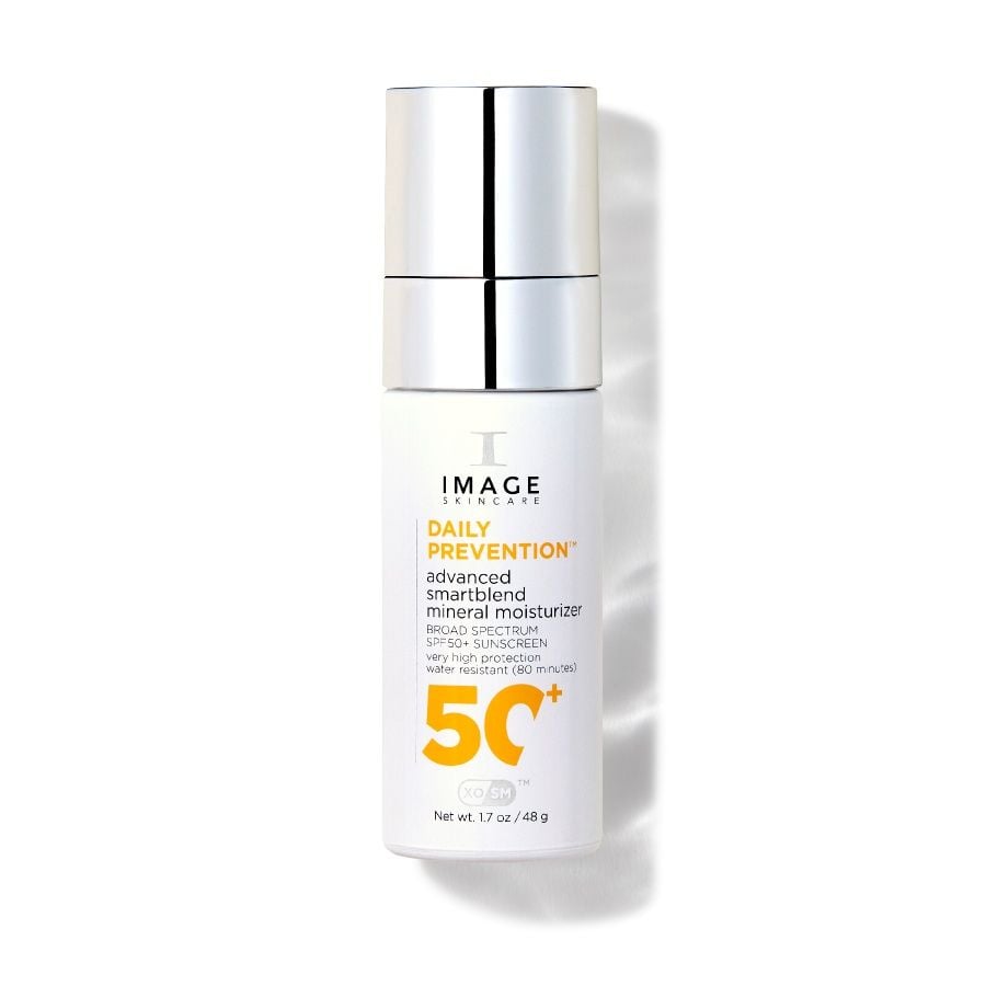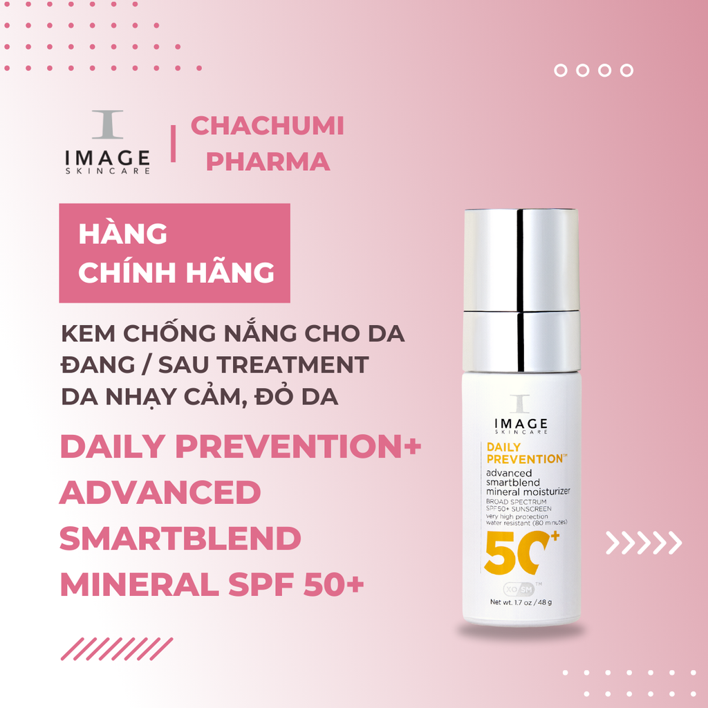 DAILY PREVENTION Advanced Smartblend Mineral Moisturizer SPF 50 là kem chống nắng vật lý thế hệ mới đến từ thương hiệu Image Skincare (Mỹ), được thiết kế dành riêng cho làn da nhạy cảm, da dễ kích ứng hoặc sau điều trị thẩm mỹ. Với công nghệ Smartblend™ độc quyền, sản phẩm mang đến lớp màng chắn khoáng chất tự nhiên, bảo vệ da toàn diện trước tia UVA/UVB, ánh sáng xanh và ô nhiễm môi trường – đồng thời giúp dưỡng ẩm, làm dịu và phục hồi da hiệu quả.