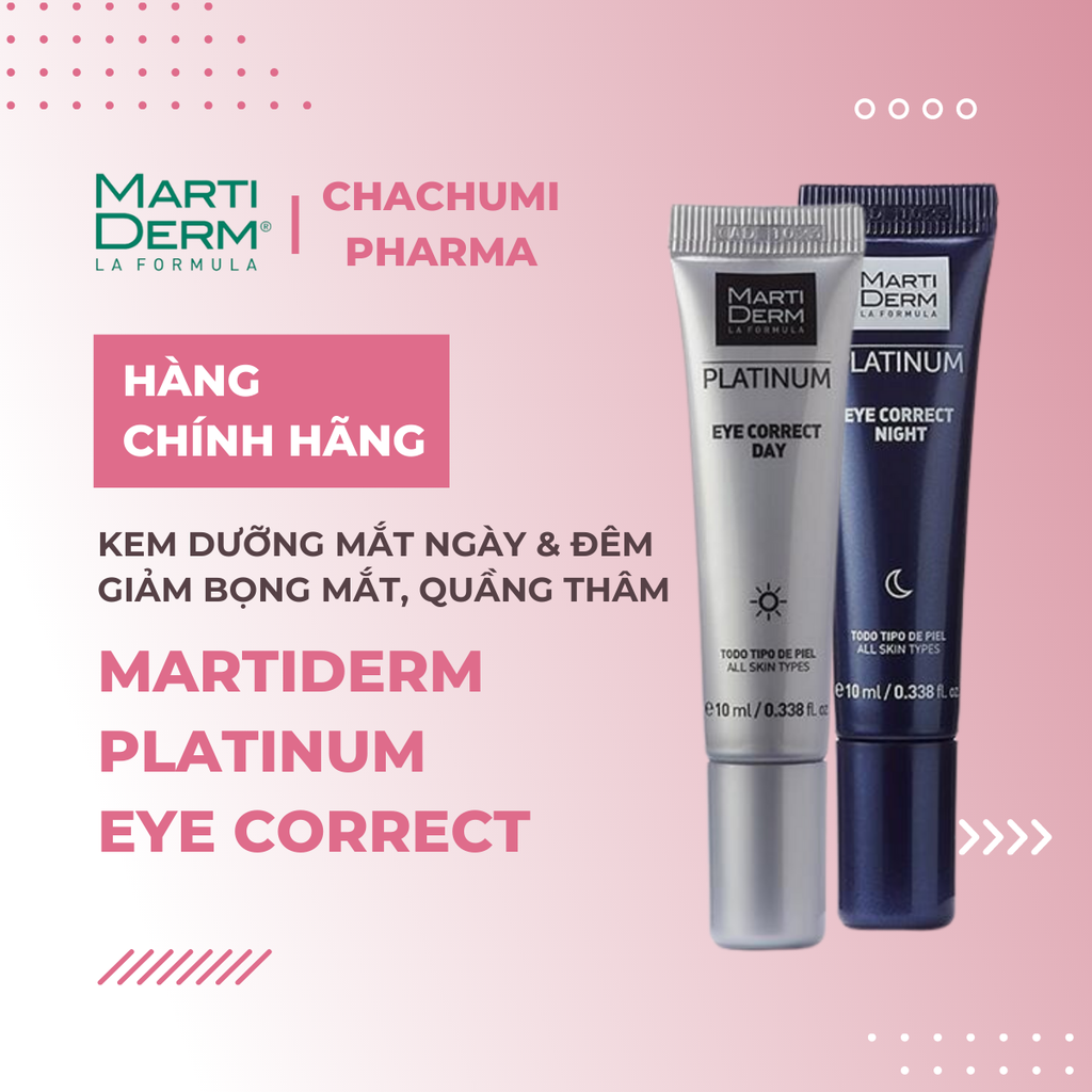 MartiDerm Platinum Eye Correct là bộ kem dưỡng da vùng mắt gồm 2 tuýp riêng biệt, dùng vào buổi sáng và buổi tối, phù hợp để sử dụng hằng ngày cho da mắt đang gặp các vấn đề về quầng thâm và bọng mỡ dưới mắt. Công thức chứa phức hợp độc quyền Hemomelan KX (Vitamin K oxit và Tranexanic Acid) và EGCG (Epigallocatechin Gallate), đi kèm một số thành phần khác nhau ở mỗi sản phẩm. Kết cấu dịu nhẹ cho vùng da nhạy cảm và cực kì mỏng manh dưới mắt. Sản phẩm giúp vừa chăm sóc vừa giúp che khuyết điểm mà không cần phải sử dụng đến các loại kem trang điểm dày bí khó chịu.