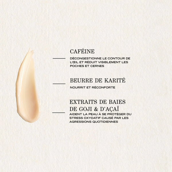 Với thành phần giàu vitamin C & siêu trái cây chống oxy hóa, sản phẩm phục hồi vùng da quanh mắt mệt mỏi, xỉn màu do thiếu ngủ, stress hoặc tác động từ môi trường. Kết cấu mỏng nhẹ, dễ thẩm thấu, phù hợp sử dụng sáng và tối, kể cả trước lớp trang điểm.