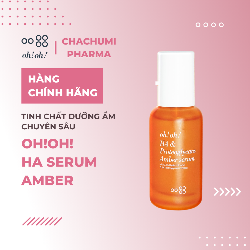 oh!oh! HA serum : amber là sản phẩm tinh chất dưỡng ẩm dành cho mọi loại da đến từ thương hiệu mỹ phẩm oh!oh! (Hàn Quốc). Công thức bao gồm hỗn hợp các thành phần dưỡng ẩm dồi dào có khả năng thẩm thấu nhanh chóng và sâu vào bên trong da, cung cấp độ ẩm tức thì và lâu dài, đồng thời làm dịu, dưỡng sáng và củng cố hàng rào bảo vệ da, ngăn ngừa hình thành nếp nhăn, giúp da săn chắc và căng mượt mịn màng. Kết cấu serum giàu ẩm nhưng lỏng nhẹ, cho cảm giác tươi mát ngay sau khi thoa.